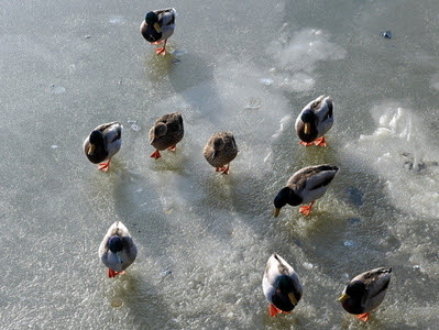 上星期德国气温一度达到最低零下7度。图为几只鸭子在德国北方的Neuharlingersiel港的冰面上行走。