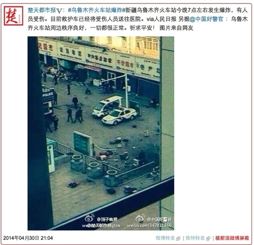 北京时间4月29日19:15左右,乌鲁木齐火车站发生爆炸,最先报导此消息的是新华社官微@新华-我报导 的英文简单报导,随后遭到删除。大陆《财经网》官方微博挖掘到账号“中国好警官”最早发出一组爆炸现场照片,目前有关此消息的报导和照片都遭屏蔽。