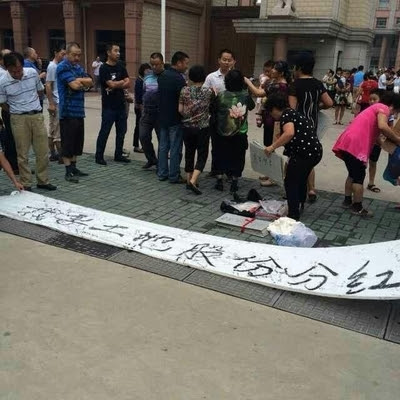 8月25日上午9:00~10:00,张家港市金港镇长江村二百多村民陆陆续续来到村委会门前聚集,村民手举着“我要土地”、“ 我要吃饭”、“严禁卖地 归还进港费”等自制纸牌抗议。