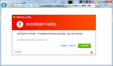 经过网站技术人员检测后,发现这是来自大陆的360安全软件(目前我们测试了“360安全卫士”、“360杀毒”)将《看中国》网站误判而列入了“木马”网站。