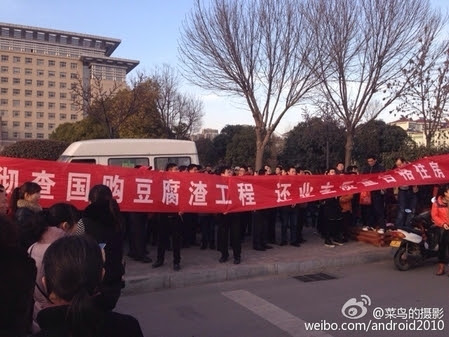 3月3日,安徽省淮北市国购广场数百业主打出“业主坚决维权,政府还我家园”等大型横幅,到市政府抗议房屋质量低劣及物业费过高,遭警方殴打并有多人被抓捕。(网络图片)
